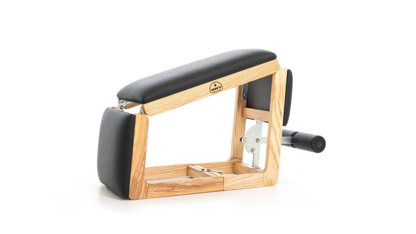 Ein Multifunktionsgerät aus Leder und Holz, das sich sehen lassen kann: Der TriaTrainer ist Bauchtrainer, Rückentrainer und Hantelbank in einem – und benötigt im eingeklappten Zustand weniger als einen Quadratmeter Platz.